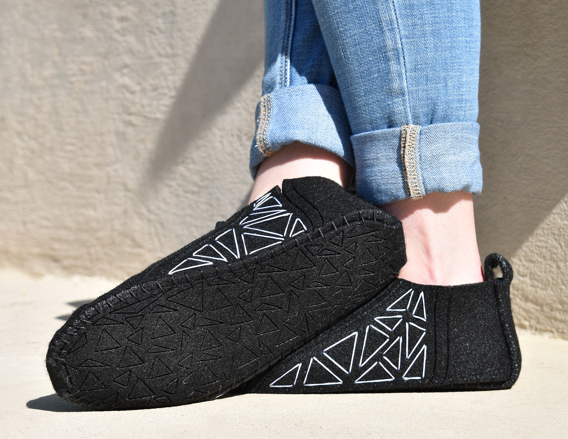treo is created from a pattern laser cut into felt. The pattern was drafted by hand by wrapping a foot last in tape and drawing the design onto the tape. The tape was then removed and the pattern was cut apart in such a way that it could lay flat and be packed flat before assembly. The triangular pattern on the sides of the shoes was hand-stitched into the felt once the pattern shape was cut. Once the user receives the shoes, they would assemble them by sewing them together by hand.